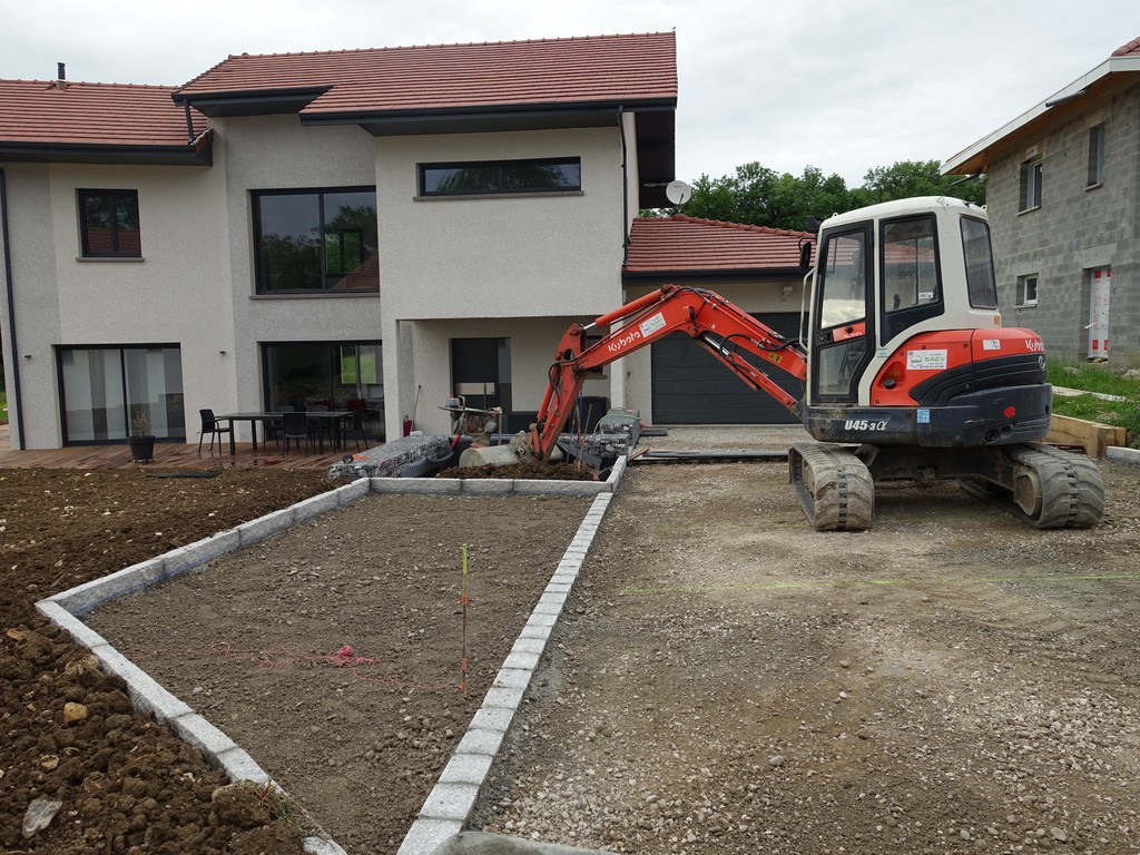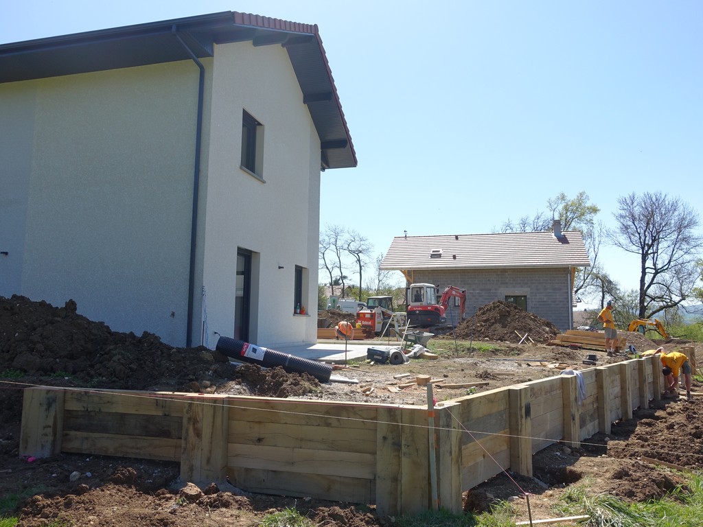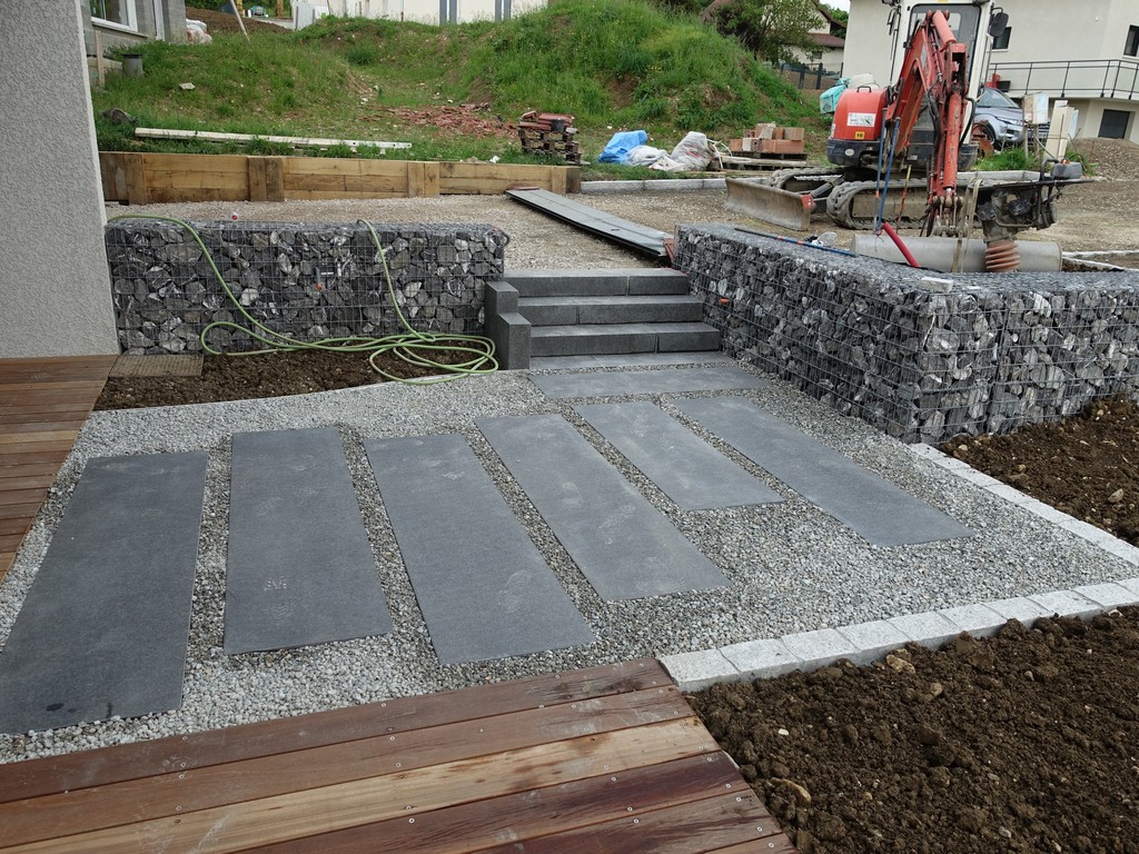 La limite de propriété a été réalisée par un mur de soutènement en chêne, des gabions viennent trouver leurs places à l'entrée de la propriété, le tout permettant de venir soutenir la zone voirie et stationnement.